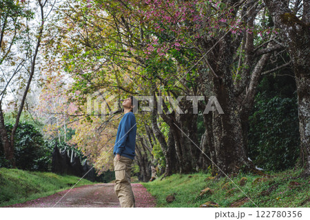 solo traveler in nature concept with asian man camping and sightseeing with pink cherry blossom tree in springtime season