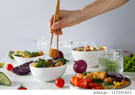 Fried tofu salad in a bowl with chopsticks
