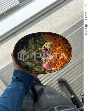 Wakame salad in a bowl and bamboo sticks