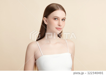 Beautiful young woman with clean fresh skin on beige background, Face care, Facial treatment, Cosmetology, beauty and spa, women portrait.