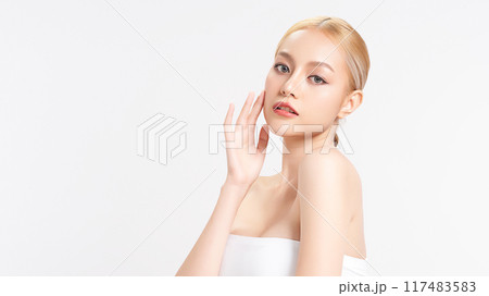 Beautiful young woman with clean fresh skin on white background, Face care, Facial treatment, Cosmetology, beauty and spa, women portrait.