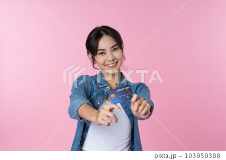 Young Asian woman showing blank credit card in formal suit, isolated pink background