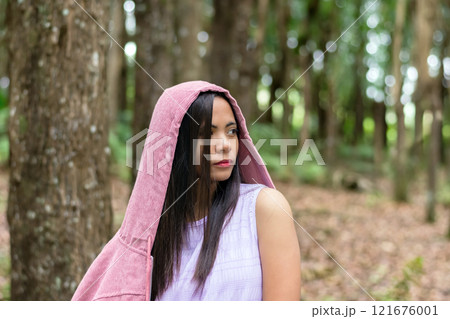 young filipino woman in the forest wearing a pink cape with a hood, walking outdoors