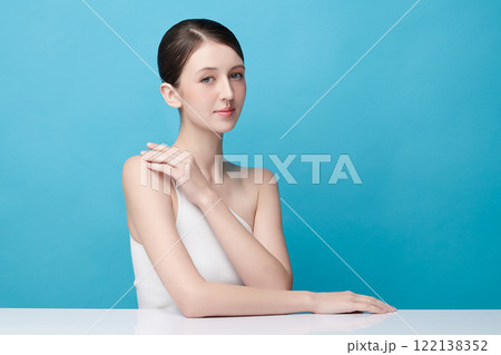 Beautiful young woman with clean fresh skin on blue background, Face care, Facial treatment, Cosmetology, beauty and spa, women portrait.