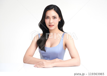 Close-up portrait of young Asian beautiful woman with K-beauty make up style and healthy and perfect skin isolated on white background for skincare commercial product advertising.