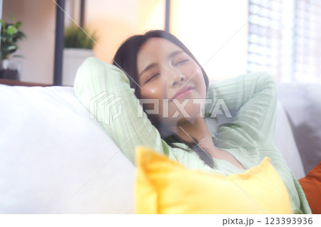 Happy young asian woman relax and leisure sitting on sofa in living room at home.