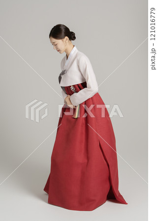 A woman in her 20s wearing a hanbok and greeting you in a polite manner