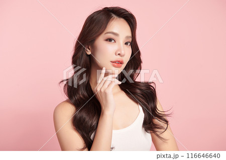 Beautiful young asian woman with clean fresh skin on pink background, Face care, Facial treatment, Cosmetology, beauty and spa, Asian women portrait.
