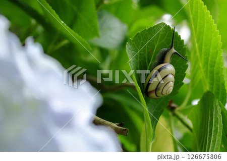 紫陽花の葉にいるカタツムリ