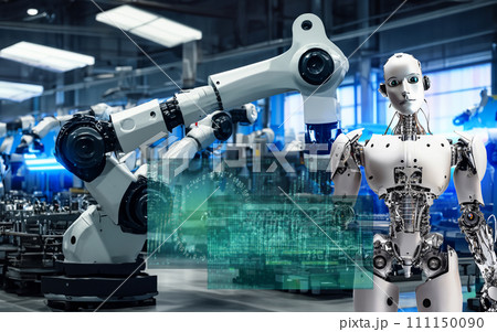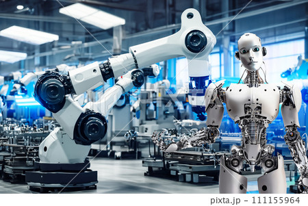 ロボットアームとロボット アンドロイド 工場 ライン アセンブル 操作 管理 品質管理
