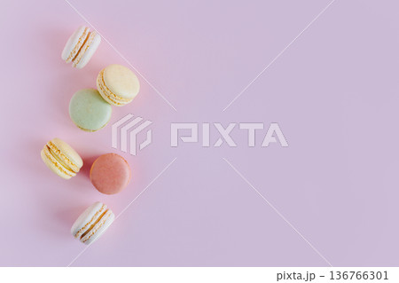 Tasty french macarons on a pink pastel background.