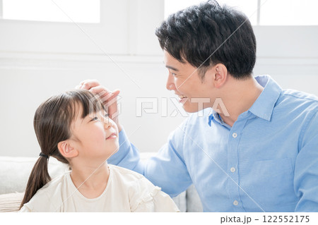 目を閉じて安らかな表情でハグする親子のイラスト(リビング)/お母さんと膝に乗る子ども