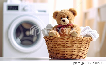 Teddy Bear in Laundry Basket in Laundry Room