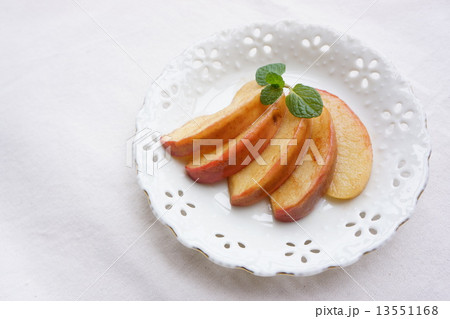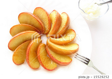 りんごのソテー シナモンスティック添え 背景赤 (アップ)