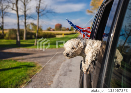 Cute small dog leaning out of car window with American flag fluttering behind, driving through quiet countryside on sunny day