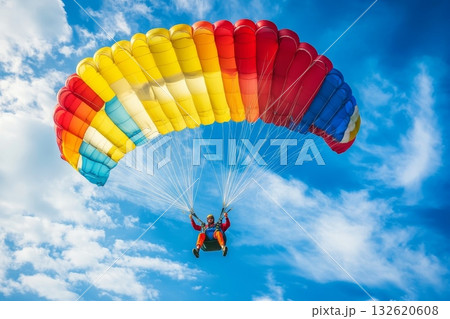 Skydiver descending with a vibrant rainbow-colored parachute against a bright blue sky with fluffy white clouds, embodying adventure and freedom