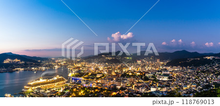 長崎港客船入港(Adora Magic City)鍋冠山からの夜景 パノラマ【長崎市】