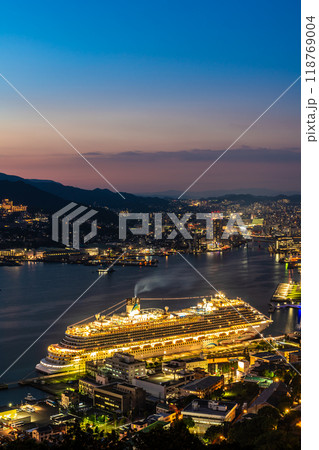 長崎港客船入港(Adora Magic City)鍋冠山からの夕景 パノラマ【長崎市】