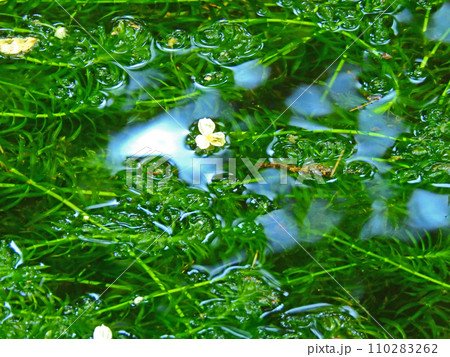 池や川などに繁殖する白い小さな花が咲いたオオカナダモ