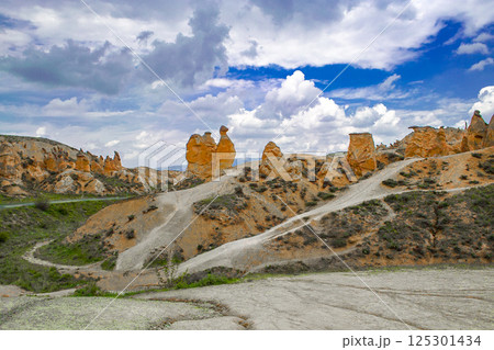 ウチヒサールの岩山とラクダ カッパドキア 世界遺産 トルコ アジア