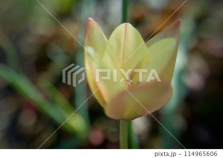 原種チューリップ「クルシアナ・アニカ」の花開く。淡い黄に淡い赤で林檎色。