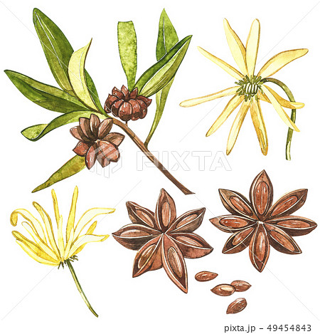 Star anise plants isolated on white background. Watercolor botanical illustration of culinary and
