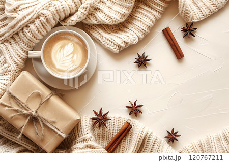Cozy winter setup with coffee, spices, and wrapped gift perfect for holiday season.