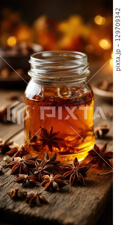 Close-up of a glass jar filled with amber-colored liquid, surrounded by dried star anise on a rustic wooden surface.