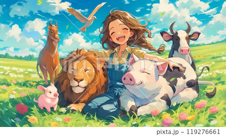 笑顔で仲良く過ごす少女とライオンと豚と牛と鳥