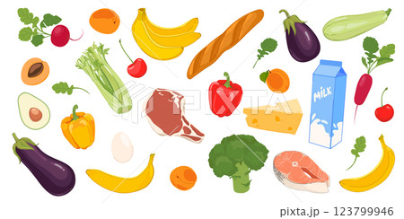 Set of vector low-calorie products. Vector fruits and vegetables, milk, bread, meat, fish, cheese and eggs. Farm harvest in flat style. Healthy eating concept.