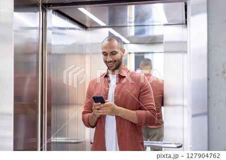 A man is smiling in an elevator while looking at his smartphone, wearing a casual terracotta shirt and a white t-shirt