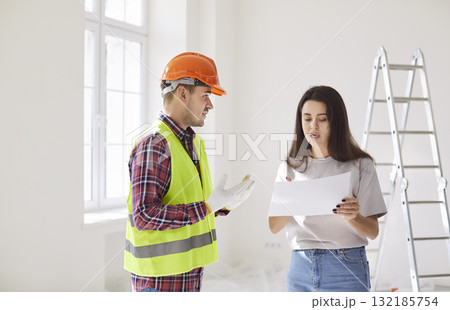 Foreman, repair worker, female client supervises to check, control and direct, project plan