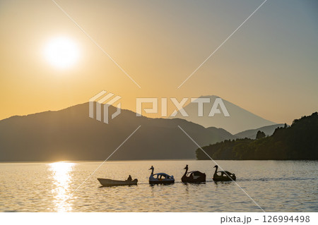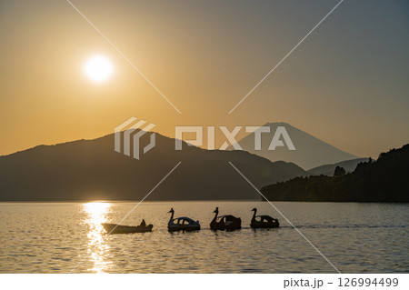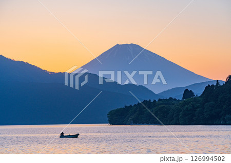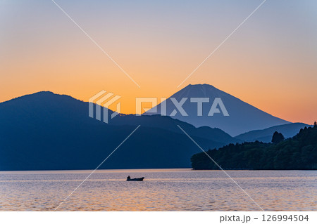 (神奈川県)夕闇迫る芦ノ湖・湖畔の情景 富士山