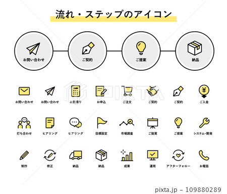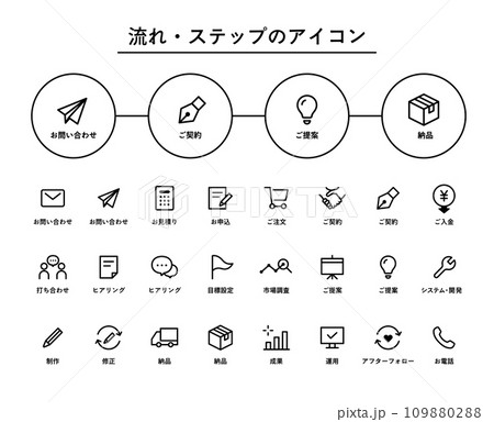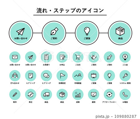流れ・ステップ・フローのアイコンのセット シンプル 取引 依頼 サービス 契約 ビジネス 申込