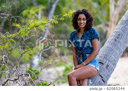 水着で砂浜に座る黒人系カナダ人の女性とサンダル