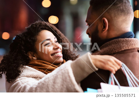 Couple In Love. Cheerful beautiful black lady hugging her boyfriend or husband, holding shopping bags and looking at him. Happy african american family walking near store outdoors in the evening