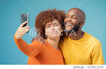 Couple, bonding or funny faces selfie on blue background, isolated mockup or wall mock up on social media. Comic, goofy or silly man and woman on photography technology in interracial profile picture