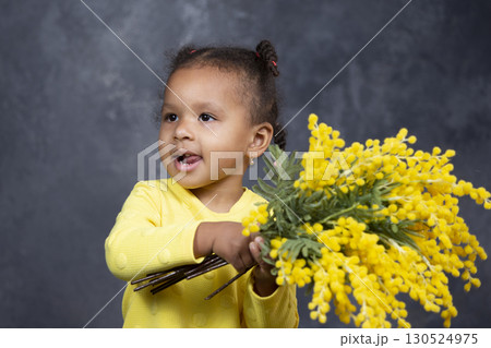 Little beautiful African American girl in a yellow dress sits on a black leather sofa.