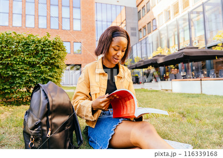 Young African American female student reading books cheerfully while sitting on grass area university campus with building in the background.
