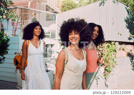 Travel, friends and black woman in summer walking by the countryside or neighborhood with outdoor fashion, wellness and youth lifestyle. Happy gen z, women or group of people with adventure and smile