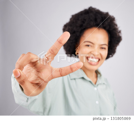 Portrait, peace and hand gesture with a woman in studio on a gray background feeling happy or carefree. Smile, emoji and sign with a happy young female indoor for freedom, wellness or good vibes