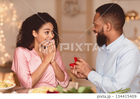 Be My Wife. Portrait of happy black man holding and giving open box with engagement ring to his surprised excited girlfriend, asking to marry him in cafe or at home during romantic date