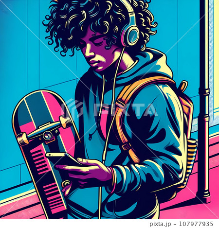 音楽を聴きながらスケートボードを持つ男性 アート 人物 素材