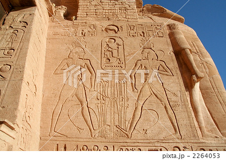 アブシンベル大神殿、入り口の上部と石像側面のレリーフ、世界文化遺産