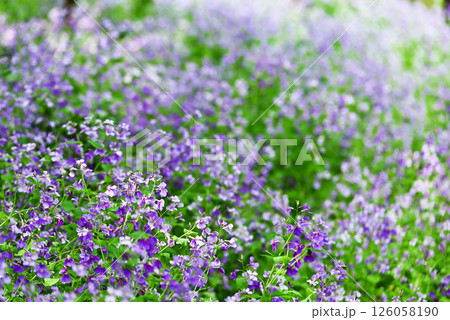春の野原に群れて咲く紫色のムラサキハナナの花