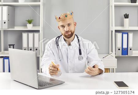 Funny young male doctor in white medical uniform sitting on workplace in clinic wearing crown.