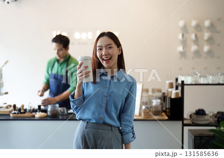 Sustainable Coffee and Community. A woman celebrating sustainability with a coffee in a vibrant cafe setting, showcasing eco-friendly choices.