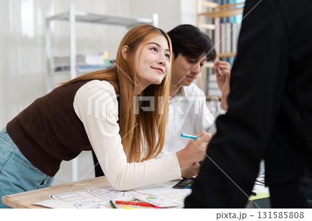 Design Collaboration and Creativity. Designers interact while reviewing UI sketches and color options in a studio.