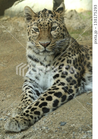 前足を伸ばしてくつろぐアムールヒョウの正面ポートレート