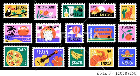 Post stamps. World landmark and architectural objects illustrations on post stamps recent vector template set